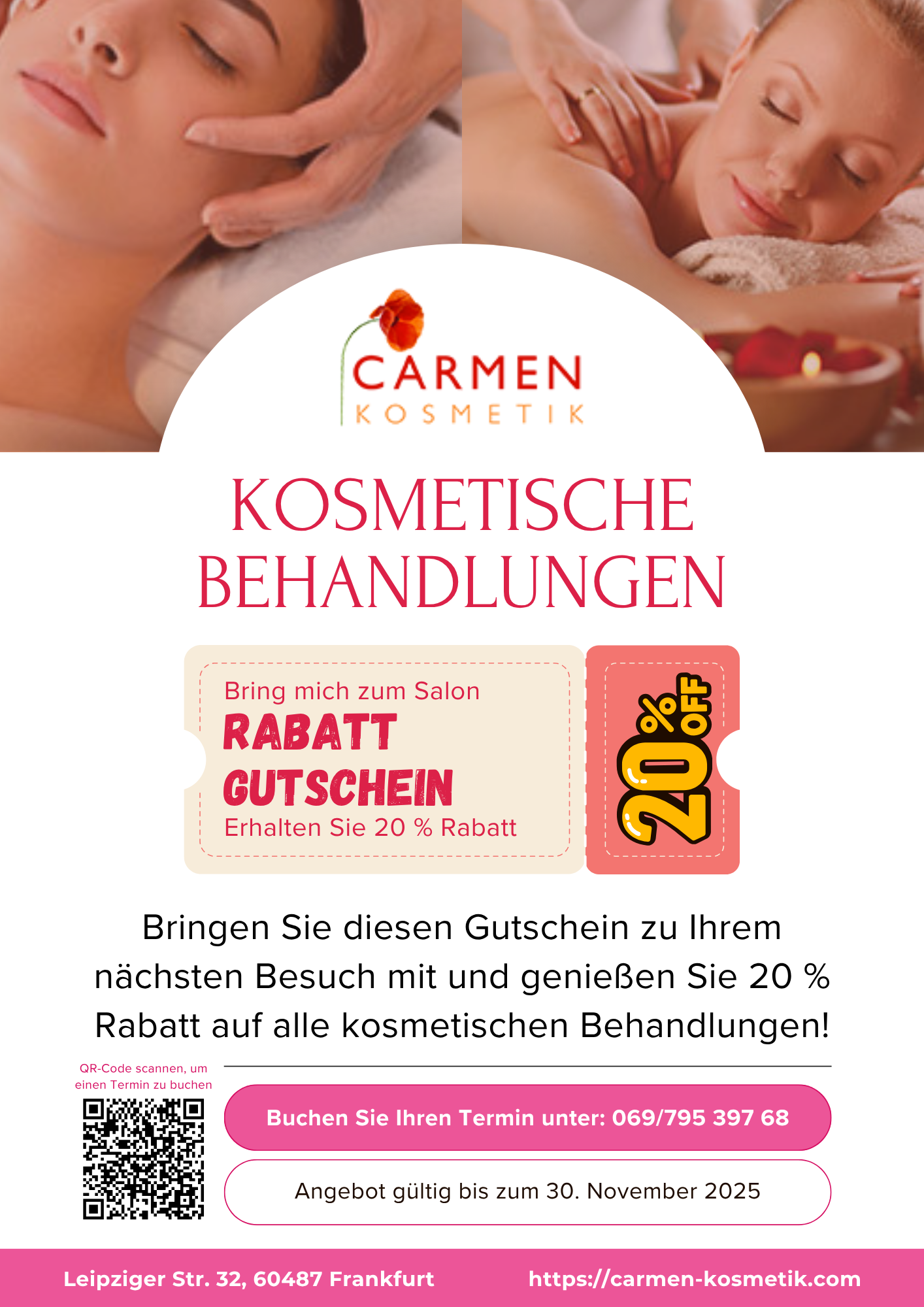Laden Sie das PDF herunter und bringen Sie es zu Ihrem nächsten Besuch mit, um 20 % Rabatt auf alle kosmetischen Behandlungen zu erhalten!
